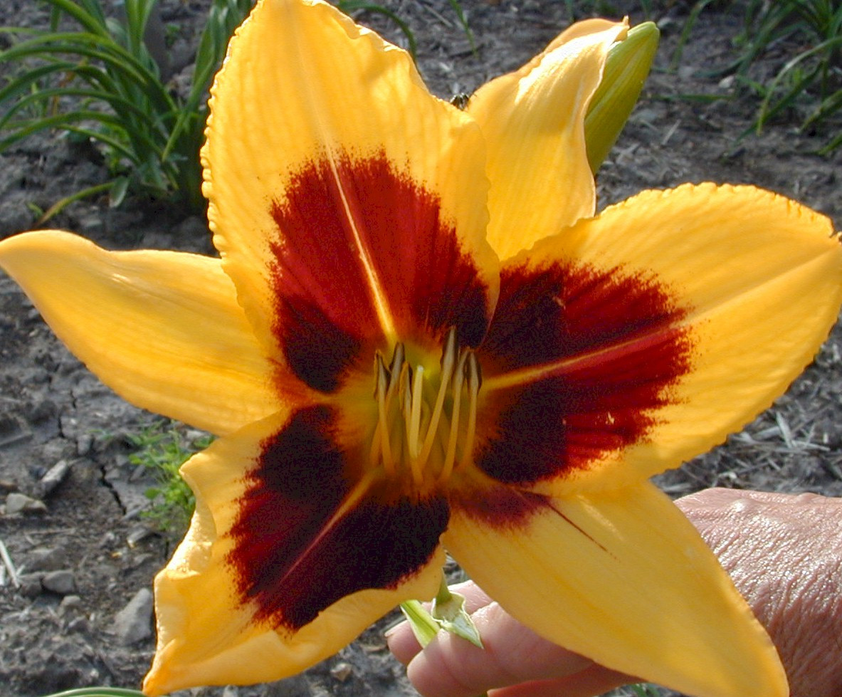 Loading... Please wait...Large gold blooms with huge bold purple halo and yellow throat sits on top of tall flower scapes!