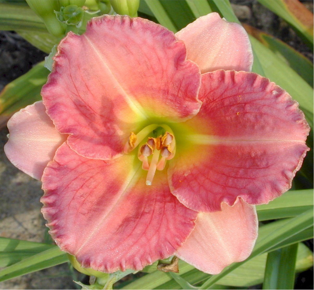 Loading... Please wait...True deep ribbon pink with a penciled rose red eye & green throat. Great branching and bud count. Form is flat and circular with heavy substance and delicate piecrust ruffling.