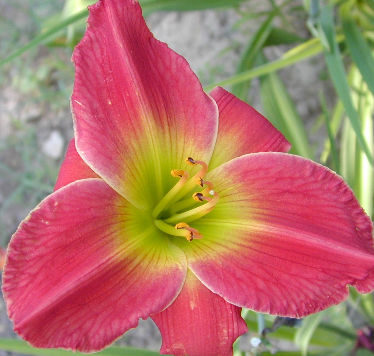 Loading... Please wait...Red with chartreuse halo and bright olive-green throat. Nice color combination.