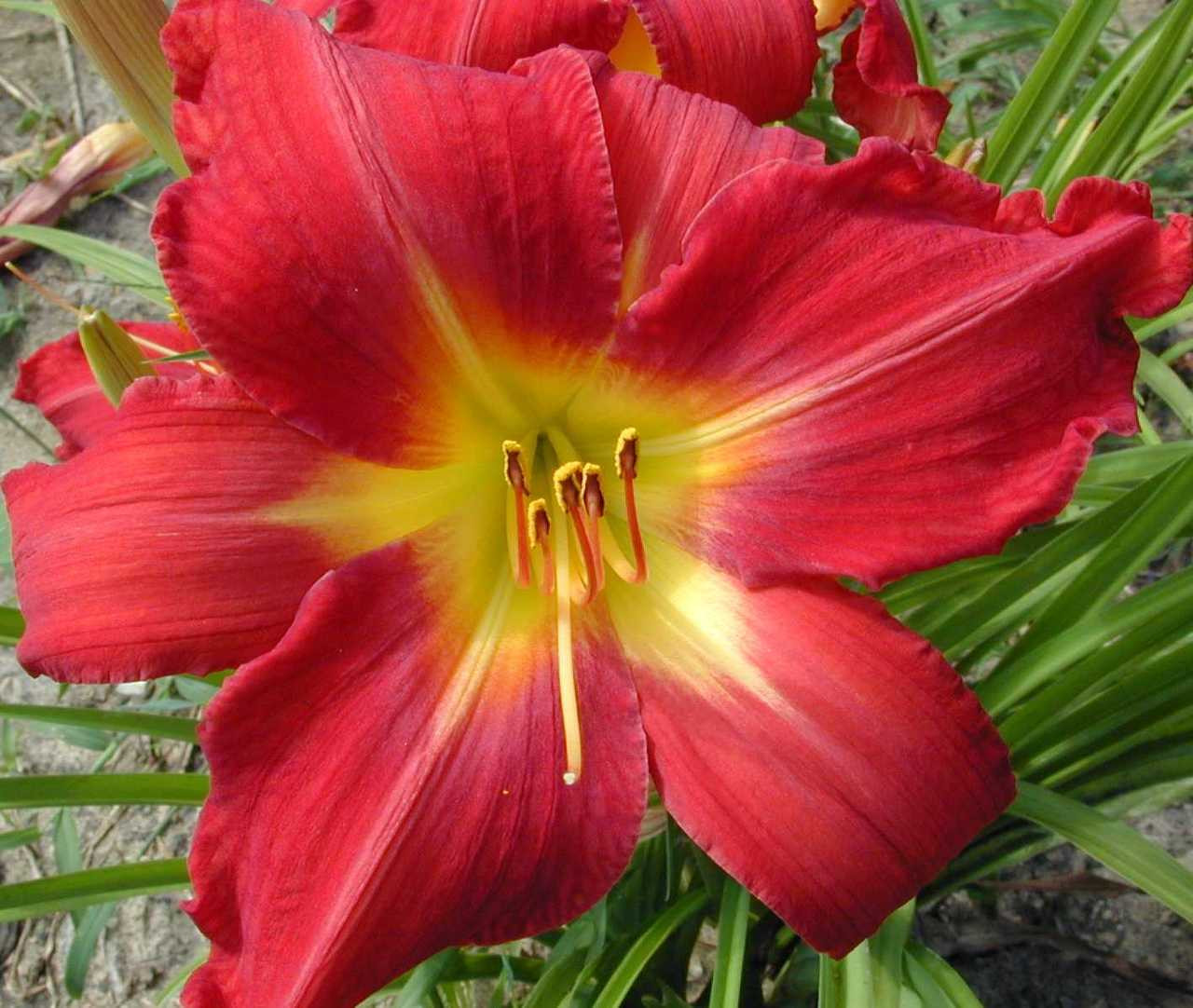 Loading... Please wait...Ruffled, brilliant cherry-red with slightly raised rib and yellow throat. Good substance and a prolific grower. A very pretty bright red!