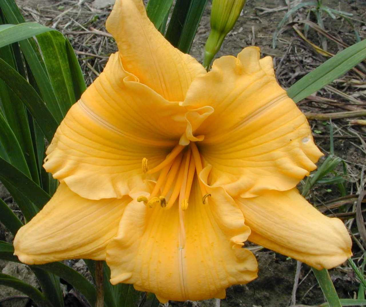 Loading... Please wait...Ruffled, tangerine gold with a raised lighter rib and dark green throat. Late rebloom. Award winner.