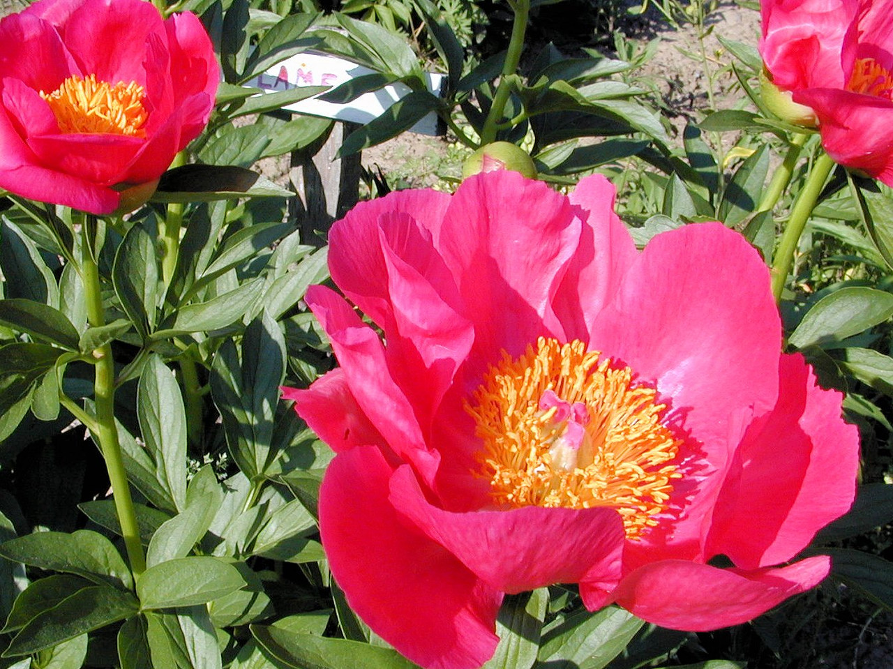 Glowing, fiery crimson-red flowers with hints of deep coral; has a sunny stamen center. Strong stems with medium green foliage. P. 'Flame' is one of our favorites!