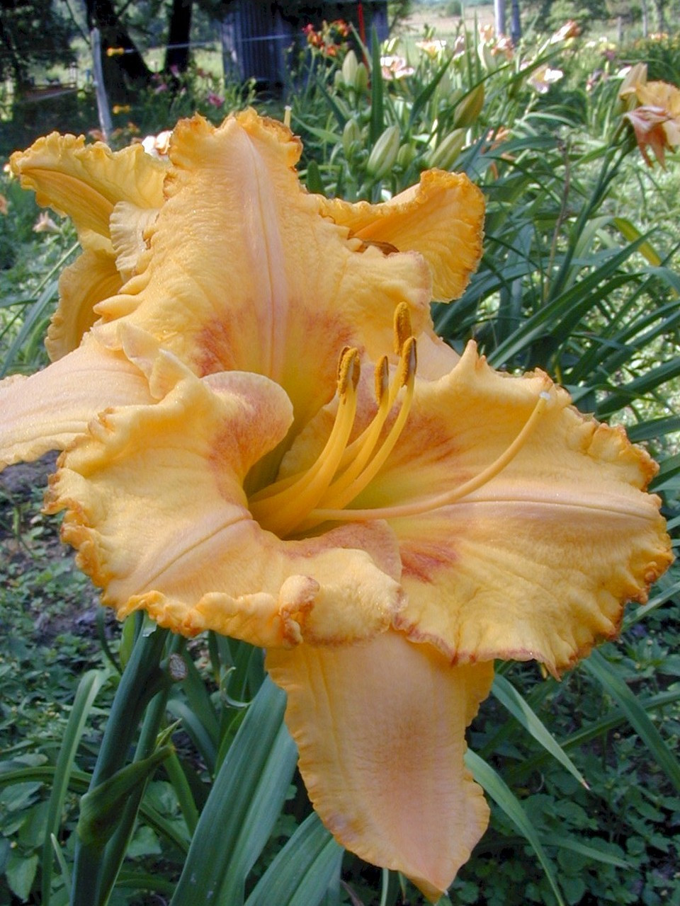 Loading... Please wait...Ruffled, yellow cream with coral red eyezone and green throat.