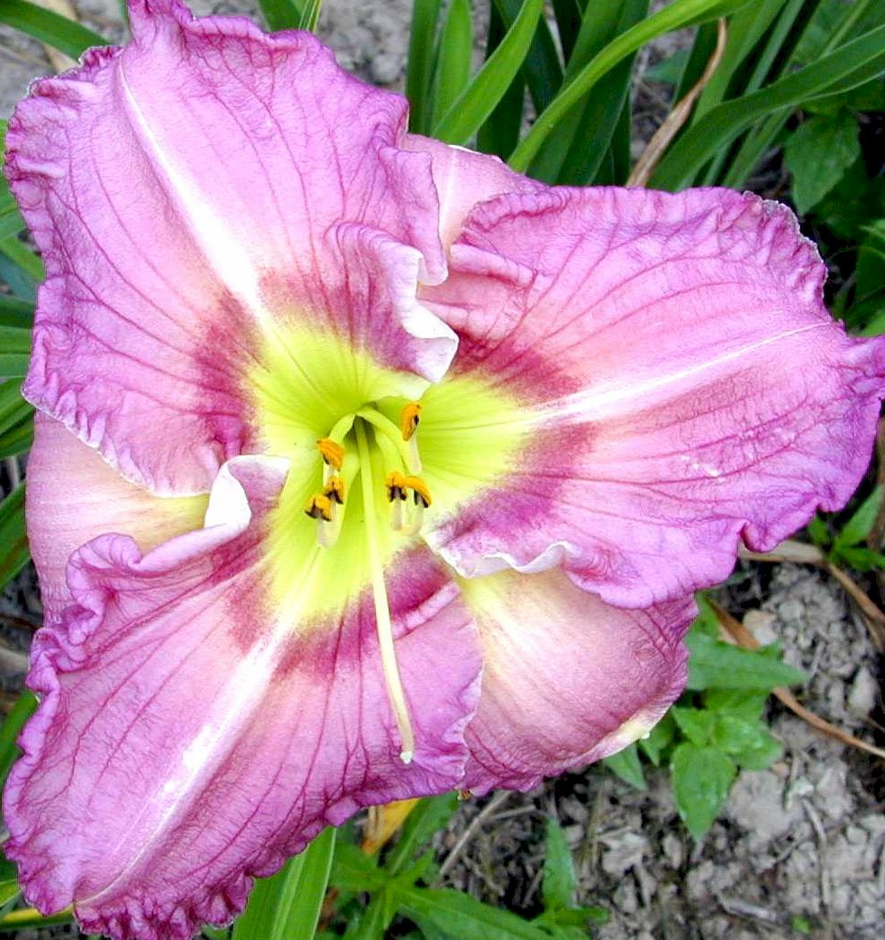 Loading... Please wait...Ruffled, light lavender or violet with a lighter raise midrib, bold magenta-purple eyezone and green throat. Late rebloom.