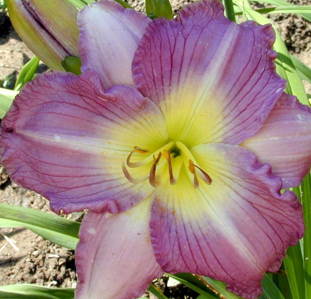 Loading... Please wait...Ruffled, dark orchid-lavender with blue powder shading and a green throat.