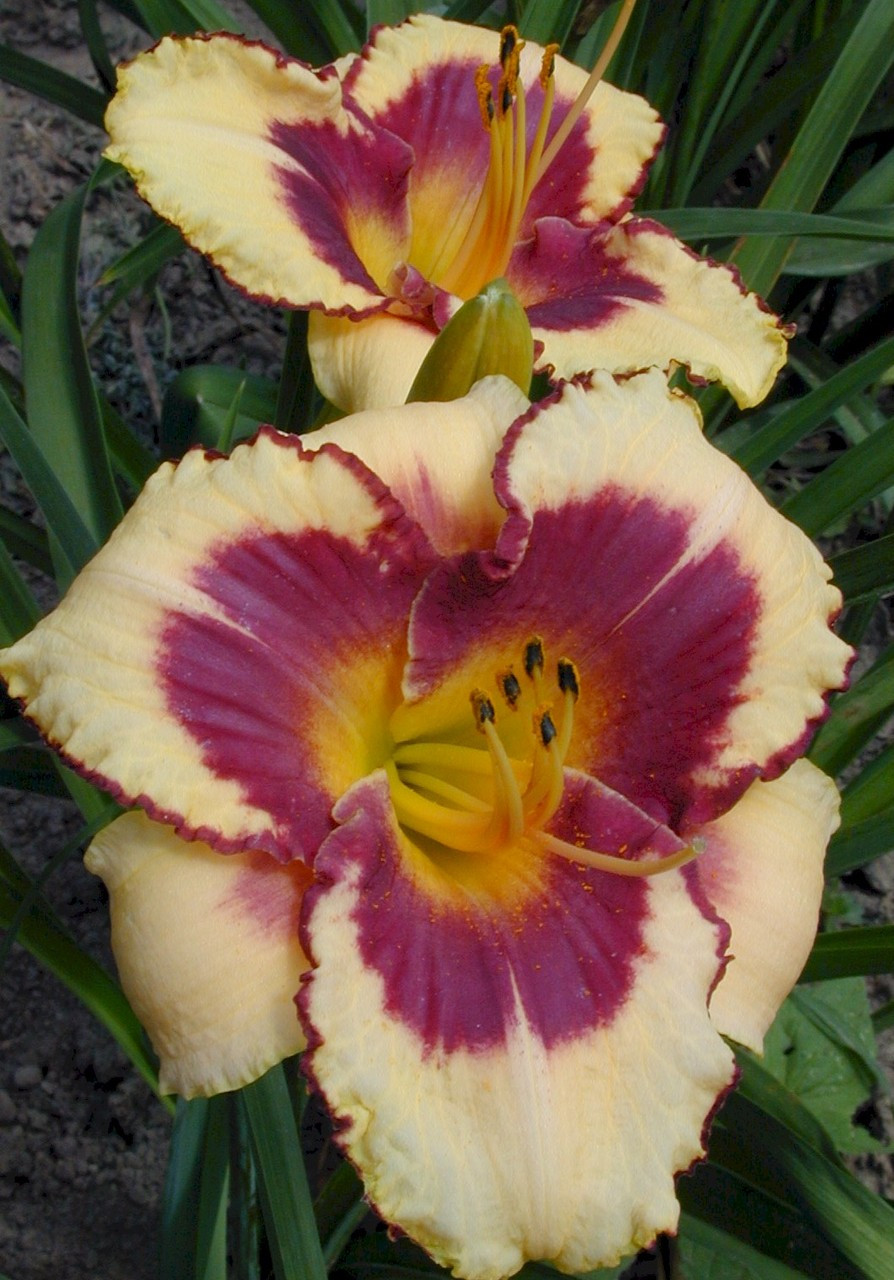 Loading... Please wait...Ruffled creamy yellow with large wine eye and edge. Long bloom and rebloom.