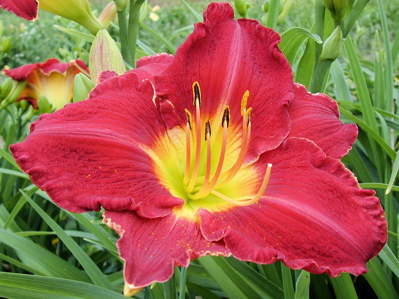 Loading... Please wait...Big, ruffled red with a darker eye and green throat. Multiple award-winning red.